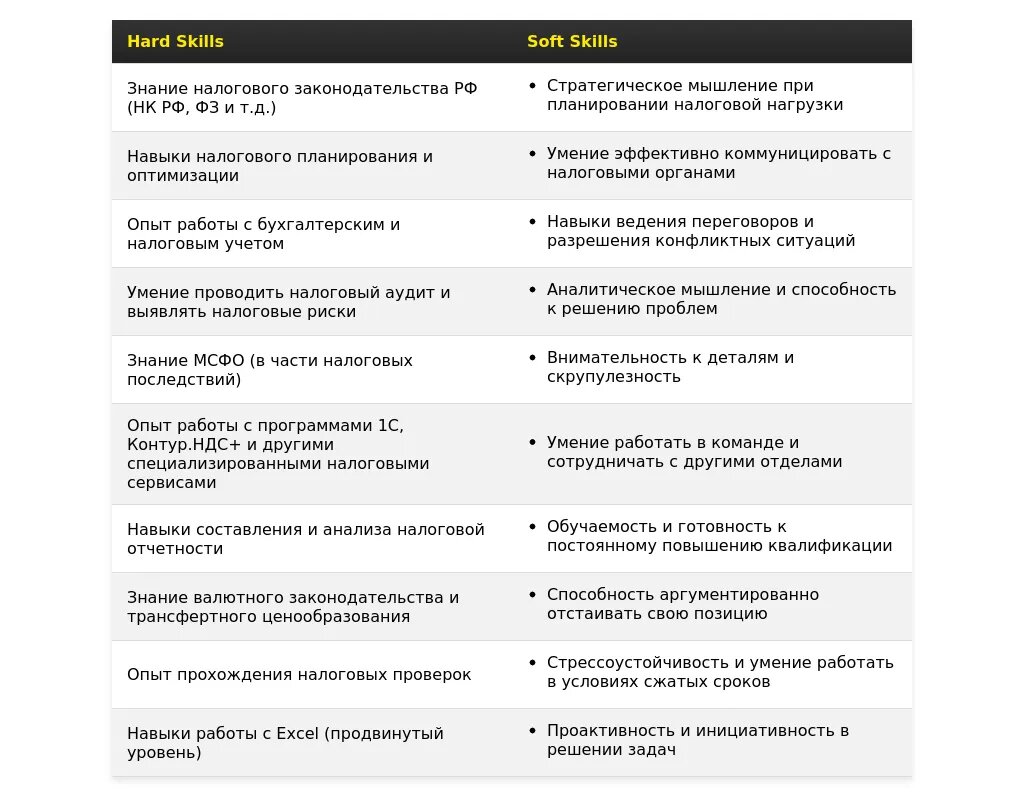 Ключевые навыки и компетенции, релевантные для налоговой сферы.