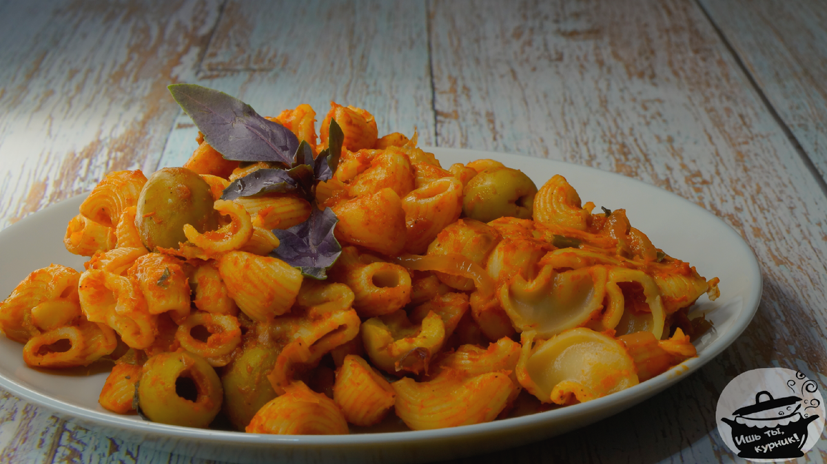 Ингредиенты: · макаронные изделия – 1 пачка; · томаты протертые – 400 гр.; · оливки – 1 б.; · базилик – 1 веточка; · чеснок – 3 зубчика; · лук красный – 1 шт.; · лук зеленый – 4-5 перьев; · соль – ½ ч.л.; · сахар – ½ ч.л.; · перец черный молотый – ½ ч.л. Приготовление: макароны отварить аль денте. На разогретой сковороде обжарить чеснок, выбросить, на этом же масле обжарить мелко порезанный лук. Добавить томаты, обжаривать 3 минуты. Добавить мелко порезанную зелень, соль, специи, оливки, прогреть все вместе еще 3 минуты. Добавить макароны и тушить 2 минуты под крышкой. Приятного аппетита!