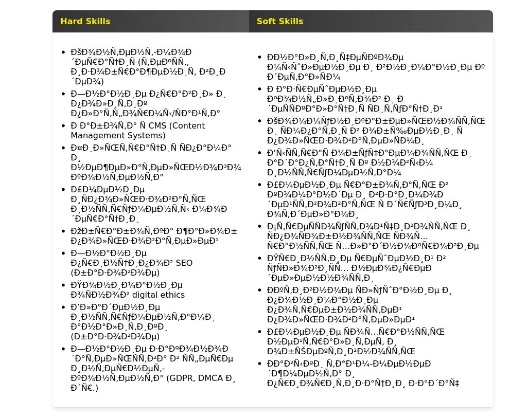 Внимательно проанализируйте описание вакансии и выделите ключевые навыки, которые требуются работодателю. Сгруппируйте свои навыки по категориям, соответствующим требованиям вакансии. Например, можно выделить категории "Коммуникативные навыки", "Технические навыки", "Навыки работы с контентом" и т.д.