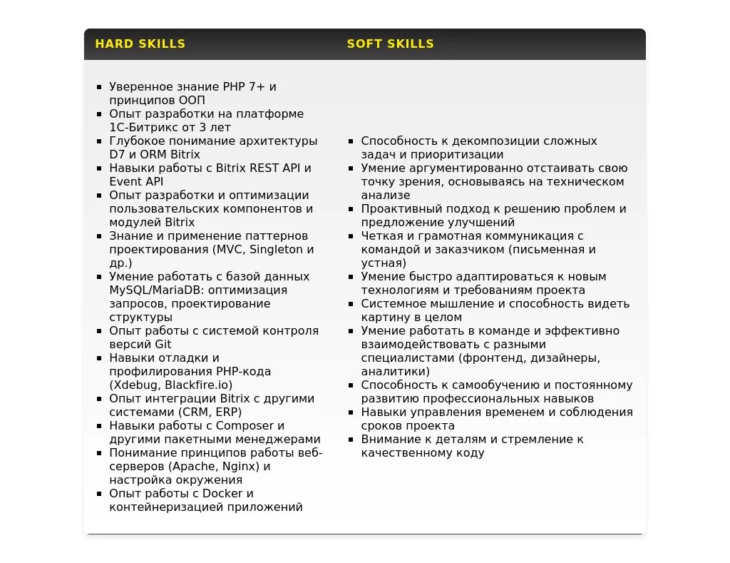 - Senior PHP-Bitrix: "Архитектурное проектирование", "Руководство командой разработчиков", "Оптимизация высоконагруженных систем", "Разработка сложных интеграционных решений", "Code review и наставничество".