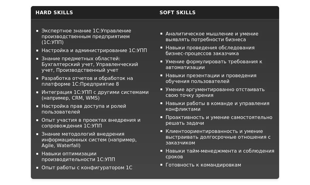- Внедрение: "Участие в проектах внедрения...", "Настройка и адаптация...", "Разработка технической документации...", "Обучение пользователей...".