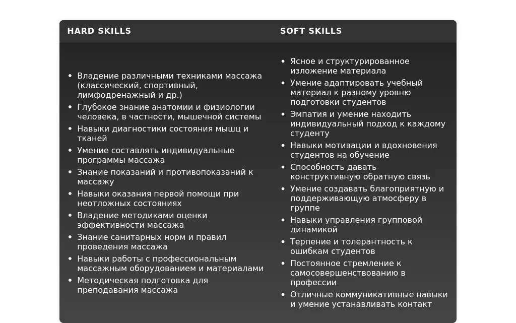 Раздел "Навыки" – это список ваших профессиональных и личных качеств, которые важны для работы преподавателем массажа. Ваша задача – показать, что вы обладаете всеми необходимыми компетенциями для успешного выполнения своих обязанностей.