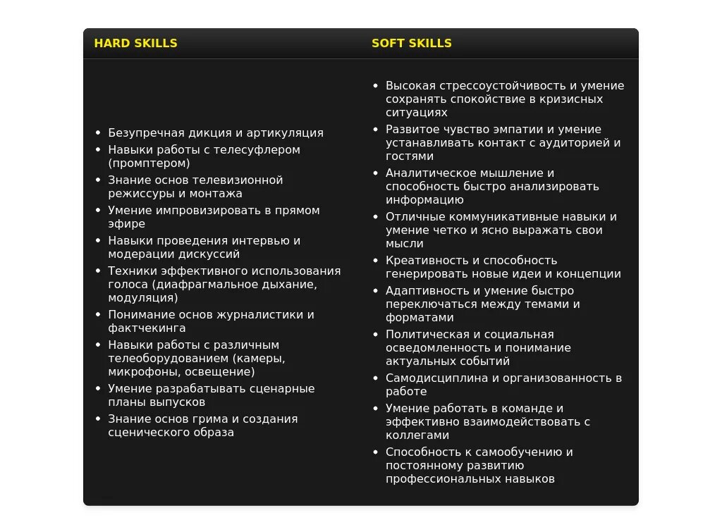 "Коммуникабельность, безупречная дикция, умение работать в прямом эфире, знание политической ситуации, стрессоустойчивость."
