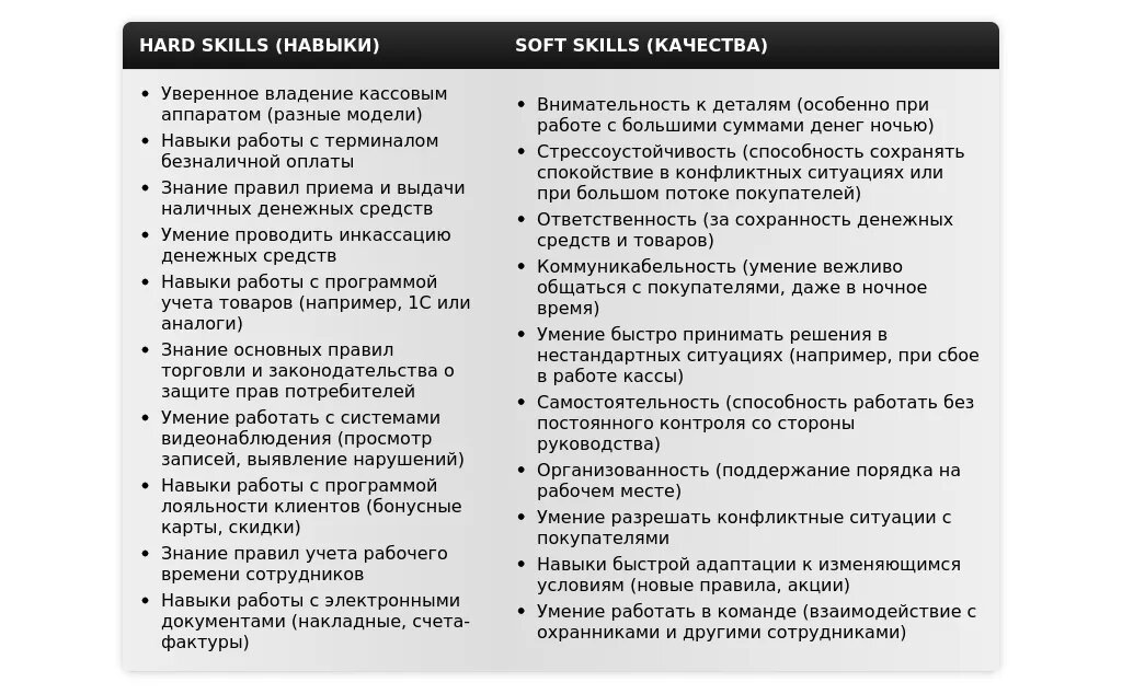 Ключевые навыки, релевантные для позиции ночного кассира.