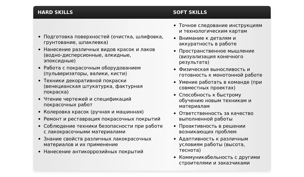 - На какие качества и навыки делать акцент: Ответственность, внимательность к деталям, аккуратность, трудолюбие, умение работать в команде, знание основных техник покраски и видов лакокрасочных материалов.
