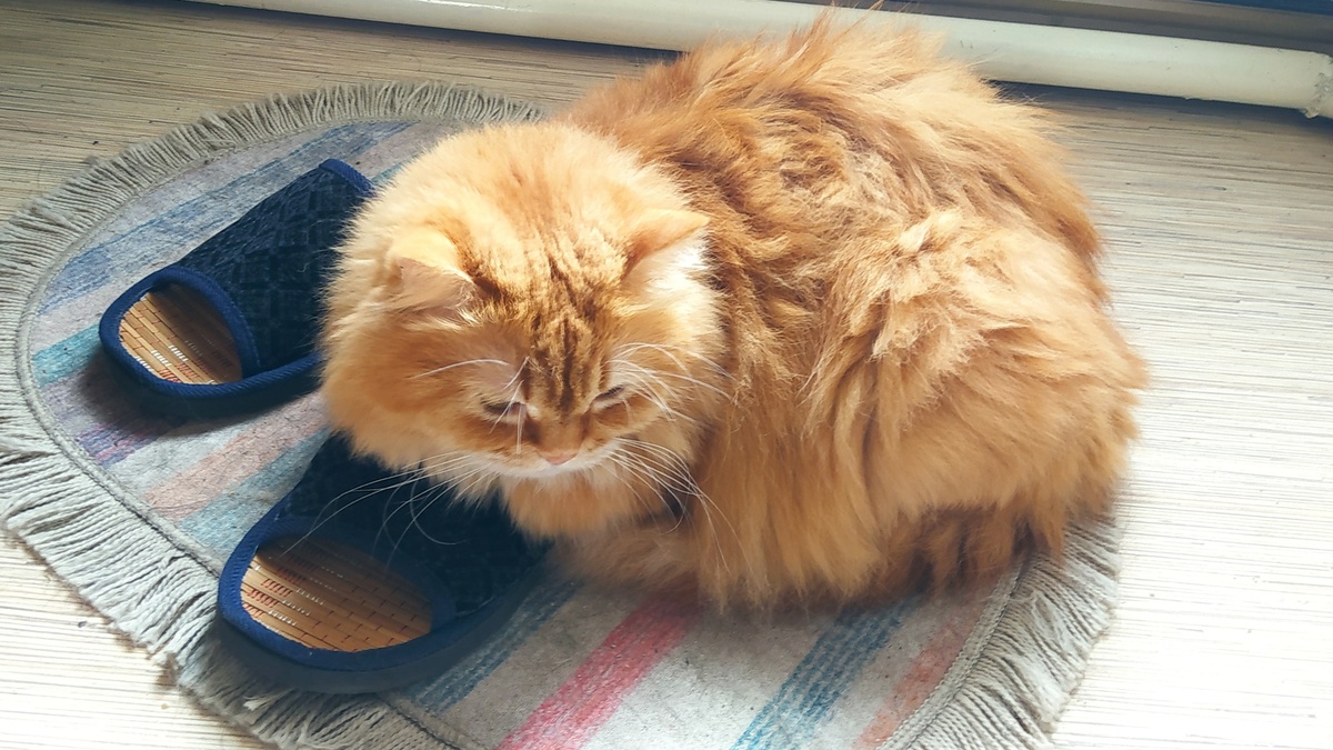 Если оставить тапки без присмотра, то рыжий Роник тут же уляжется на них, засунет в них лапы и всё - тапки уже не ваши. Кот, почему-то, очень любит греть лапы в тапках. Даже летом. Про зиму, речи нет, но зачем греть лапы летом - не понятно.
