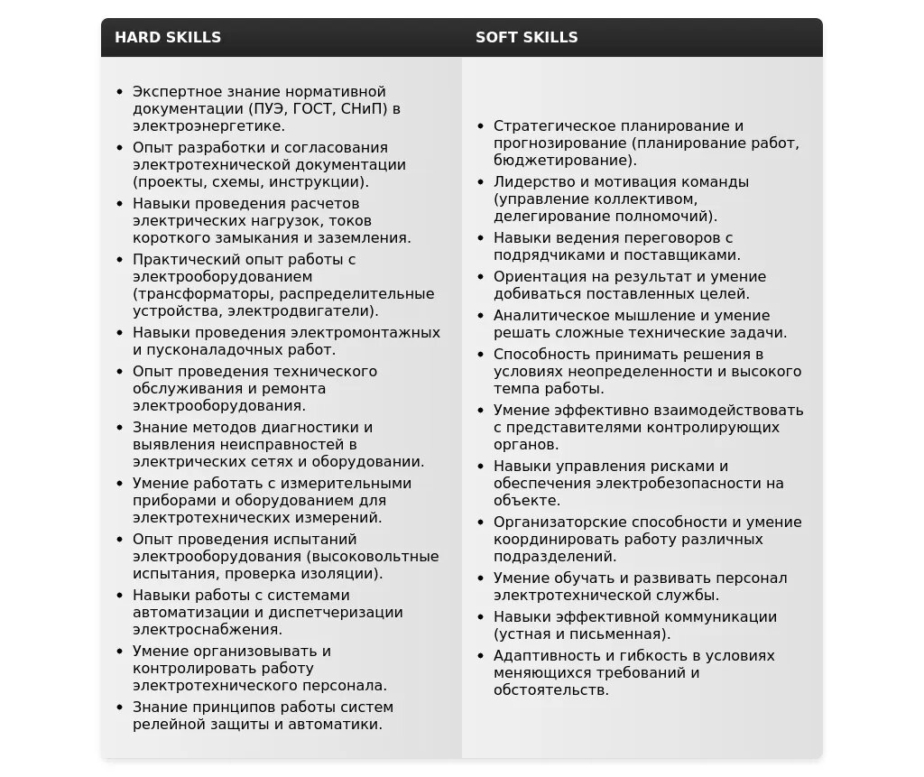 - Технические навыки: Знание электрооборудования, чтение схем, работа с измерительными приборами.