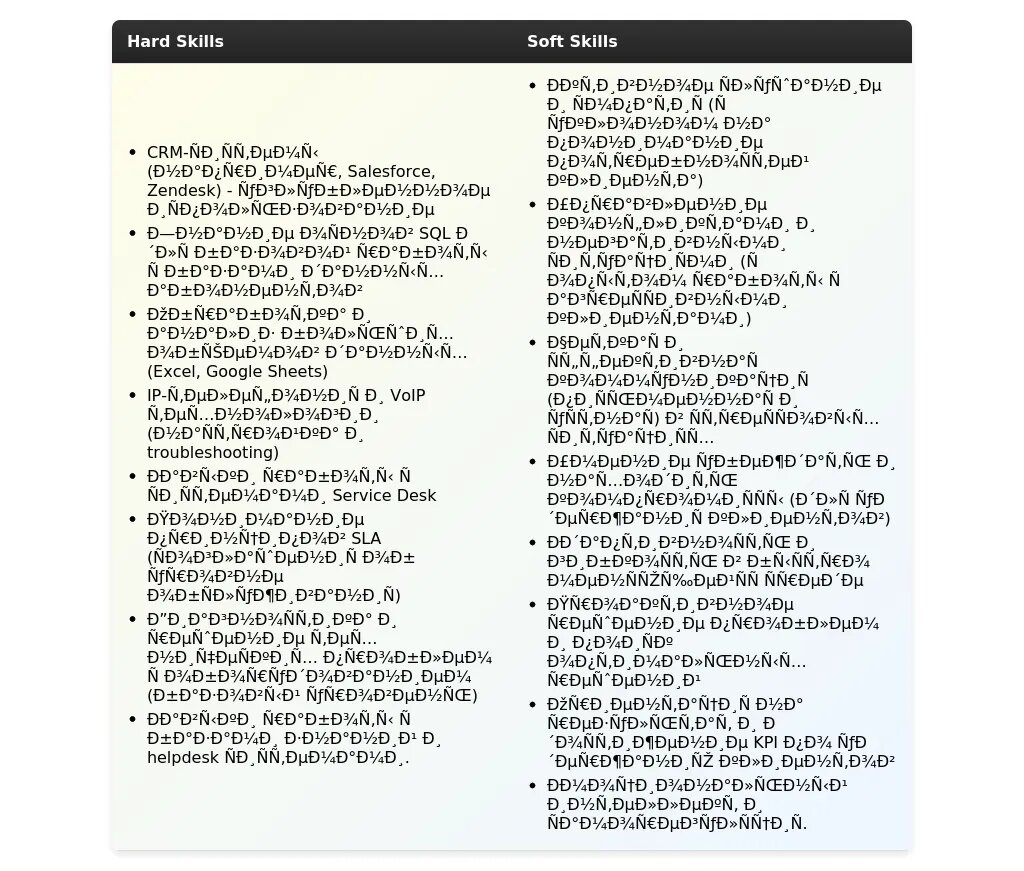 - Как описать специализацию: Укажите, с какими типами клиентов вы работали, какие продукты или услуги вы поддерживали, какие инструменты и технологии использовали.