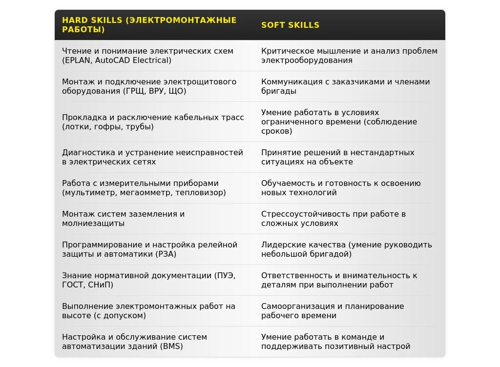 - Строительство: "Монтаж и наладка электрооборудования", "Прокладка кабельных линий", "Сборка и установка электрощитов", "Работа с проектной документацией", "Соблюдение норм и правил электробезопасности".