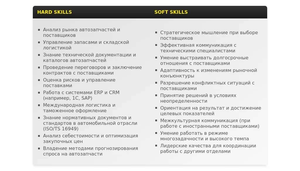 - Обязательная информация:Ключевые навыки и компетенции, релевантные для должности менеджера по закупке автозапчастей.