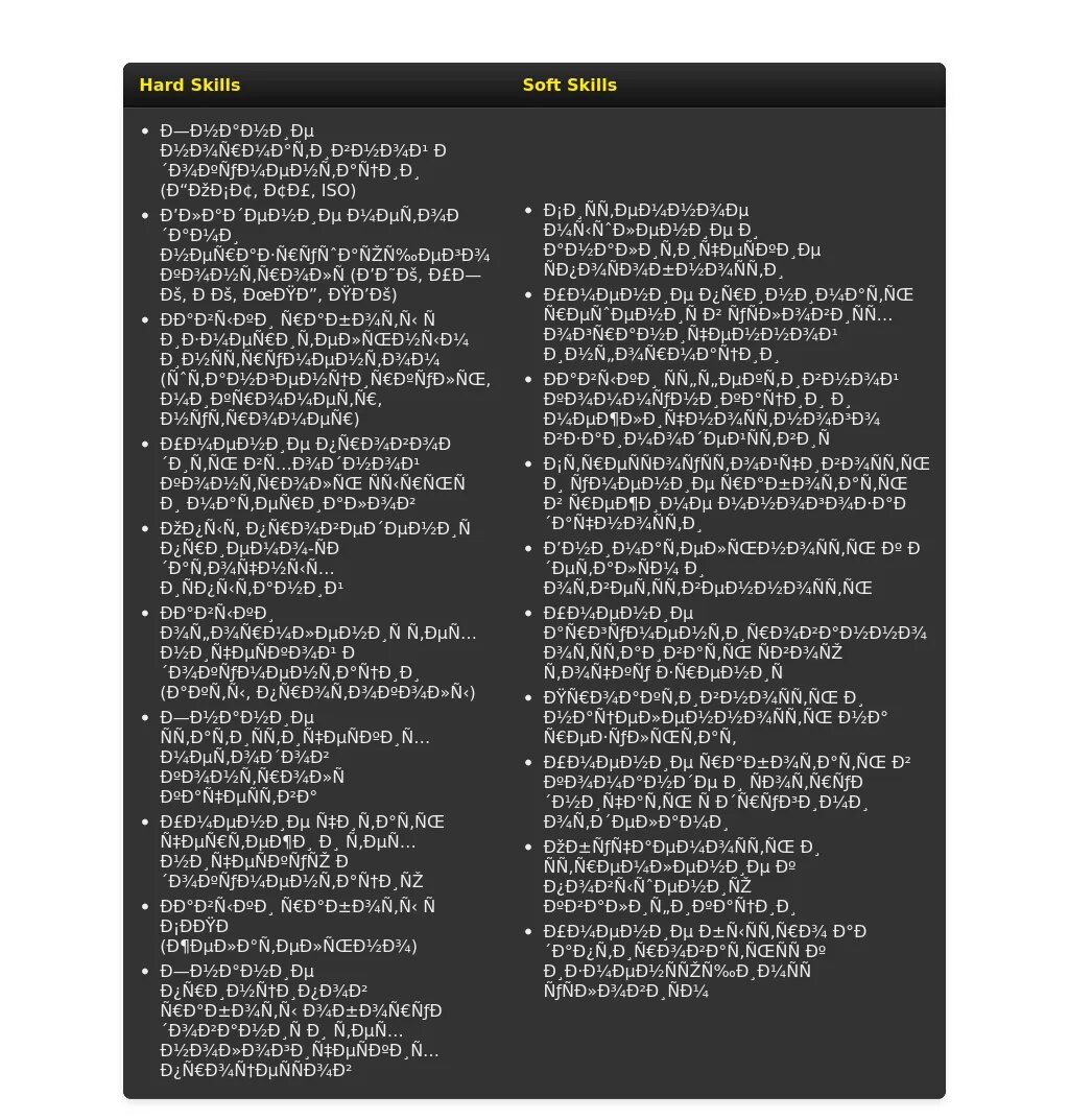 - Навыки: Список навыков должен соответствовать требованиям вакансии и включать как профессиональные, так и личные качества.