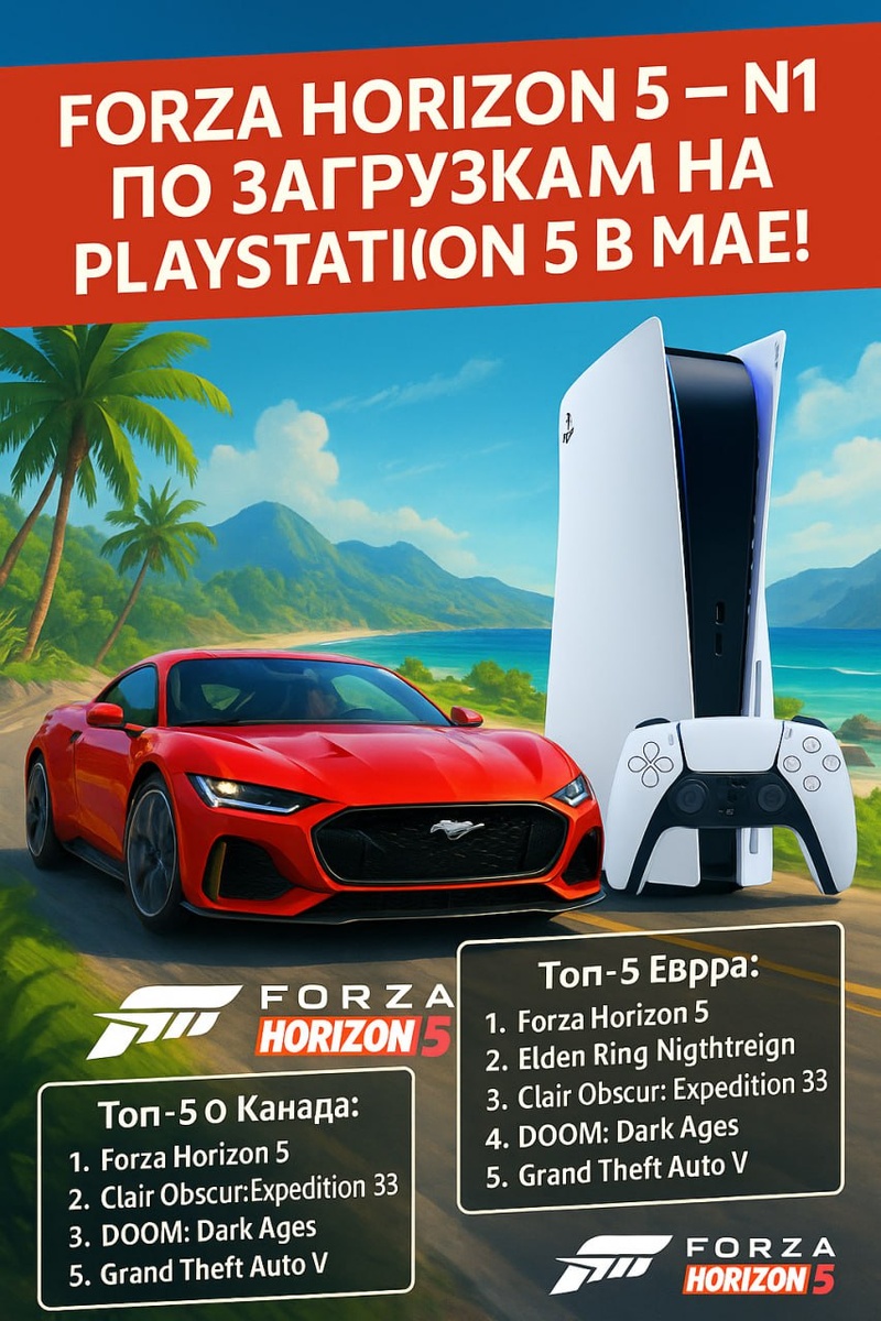 Forza Horizon 5: Xbox-хит ворвался на вершину загрузок PlayStation 5 Sony опубликовала статистику загрузок за май: Forza Horizon 5 неожиданно стала самой скачиваемой игрой месяца на PS5 в США, Канаде и Европе. Напомним, что релиз на консолях Sony состоялся только в конце апреля, но уже тогда гонка от Xbox Game Studios захватила топ-места в чартах. Среди других релизов: DOOM: The Dark Ages — только 4 место в США и 9 в Европе, а ELDEN RING NIGHTREIGN заняла второе место в Америке и пятое — в Европе. Топ-5 США и Канада: Forza Horizon 5 ELDEN RING Nightreign Clair Obscur: Expedition 33 DOOM: The Dark Ages Grand Theft Auto V Топ-5 Европа: Forza Horizon 5 Clair Obscur: Expedition 33 EA SPORTS FC 25 Grand Theft Auto V ELDEN RING Nightreign