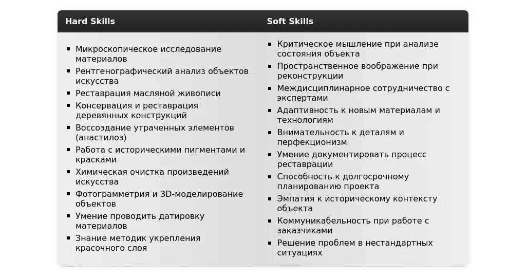 - Реставрация живописи: "Реставрация станковой живописи", "Консервация живописного слоя", "Удаление загрязнений", "Восстановление утраченных фрагментов", "Знание техник реставрации".