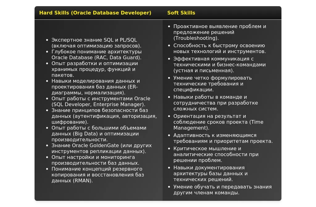 Изучите этот пример резюме разработчика баз данных Oracle, чтобы понять, как составить сильное и эффективное представление ваших навыков ✨. Такое резюме — ваш прямой путь к получению желанной работы в IT-компании.