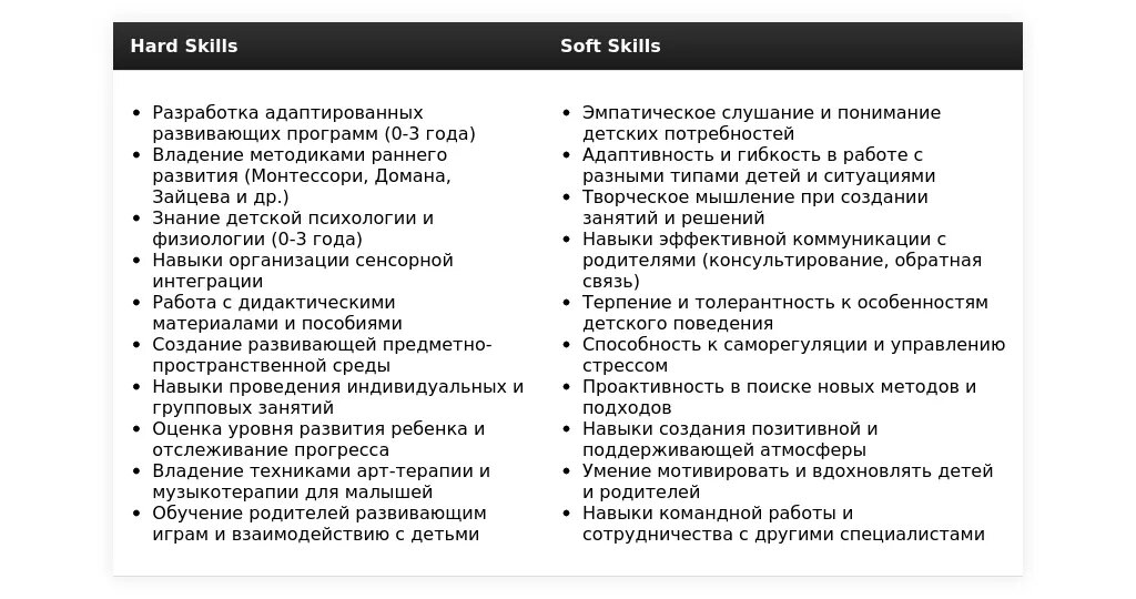Разделите свои навыки на несколько категорий (например, "Методики раннего развития", "Навыки работы с детьми", "Личностные качества") и перечислите навыки в каждой категории в порядке убывания их значимости для данной вакансии.