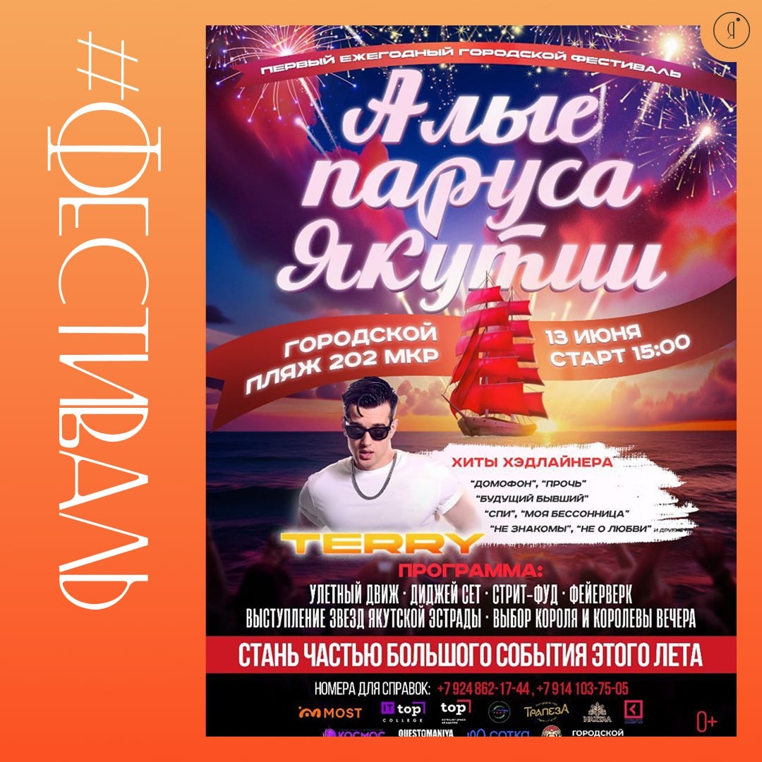 Фестиваль для выпускников «Алые паруса Якутии» #ВГороде #Концерты Хэдлайнер - певец Терри! Первый городской фестиваль для выпускников "Алые паруса Якутии" ждет именно тебя!Представь: закат над рекой, танцы до упаду, сумасшедший диджей-сет и лучший вайб этого лета. А еще – тонны вкуснейшего стрит-фуда, улетный движ и невероятная атмосфера свободы и драйва. 13 июня | 15:00 – 21:00 Городской пляж Якутска 1500 руб. Билеты Online Якутия | Подписаться