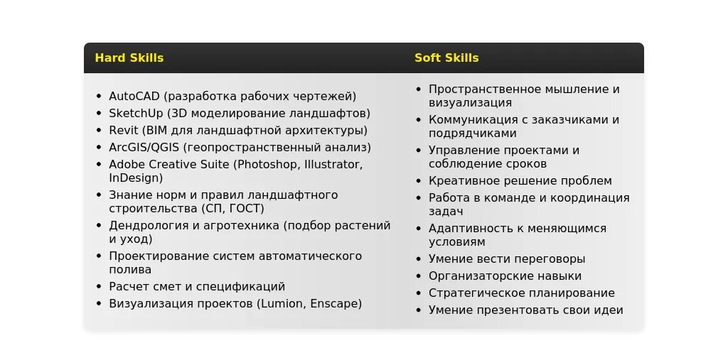 - Знание программного обеспечения для ландшафтного проектирования (AutoCAD, ArchiCAD, SketchUp и др.).