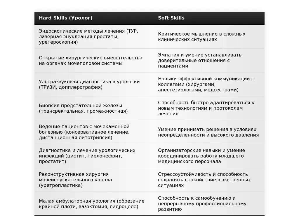 - Уролог-хирург: "Владение техниками...", "Опыт проведения...", "Хирургическое лечение...", "Эндоскопические операции...", "Микрохирургические вмешательства...".