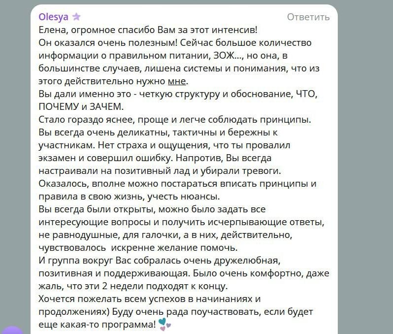 На прошлой неделе закончился первый поток интенсива "Сахарный Детокс" Мы работали в небольшой, но очень активной группе над снижением инсулинорезистентности и лишнего веса. И кстати, питание на нашей программе - это НЕ какая-то очередная модная диета, а разумная и гибкая стратегия, которой можно придерживаться всю жизнь! И посмотрите на отзывы участниц👆 - такие слова вдохновляют и мотивируют давать еще больше пользы! Другие отзывы можно посмотреть здесь. Сейчас я дорабатываю программу и добавляю несколько дополнительных полезных блоков, чтобы участники еще быстрее получали результат. И в конце июня планирую запустить новый поток интенсива. Как понять, есть ли у вас риск инсулинорезистентности и диабета? 👉 Можно почитать подборку постов или пройти тест на ИР в моем боте. И уже сейчас вы можете записаться в анкету предзаписи на июньский поток. Она ни к чему вас не обязывает, но гарантирует вам минимальную цену за 2-х недельное групповое сопровождение!💛
