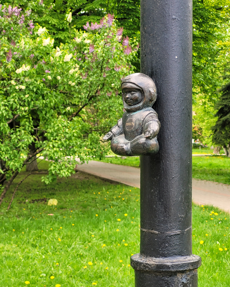 Именно космонавтики стали одной из главной целей этой поездки в Калугу. Ну потому что очень интересно — гонять по городу и собирать фигурки. Мы крепко подсели на это дело после хомлинов в Калининграде, ангелов в Тобольске, павлинов в Серпухове. Супер и детям, и взрослым. ...массово пошла по городам, хотя где-то уж очень за уши притянута — лишь бы сделать, а зачем непонятно. Но к Калуге никаких вопросов — идеальное попадание. Одно из главных космических мест страны! И фигурки космонавтов классные! Правда, налепили их — будь здоров. Искать устанешь. ...появились — плодятся быстро))) Но на момент нашего посещения было 26. И если кому надо карту со всеми отметками, могу скинуть — машите. Мы за неполных два дня везде так и не успели))) Футбольные дружки сына, которые случайно оказались в городе параллельно с нами, тоже не осилили) ...мы повсюду натыкались на конкурентов))) Даже помогали друг другу, а то некоторых малышей не так-то просто вычислить — лихо замаскированы) Но больше всего меня