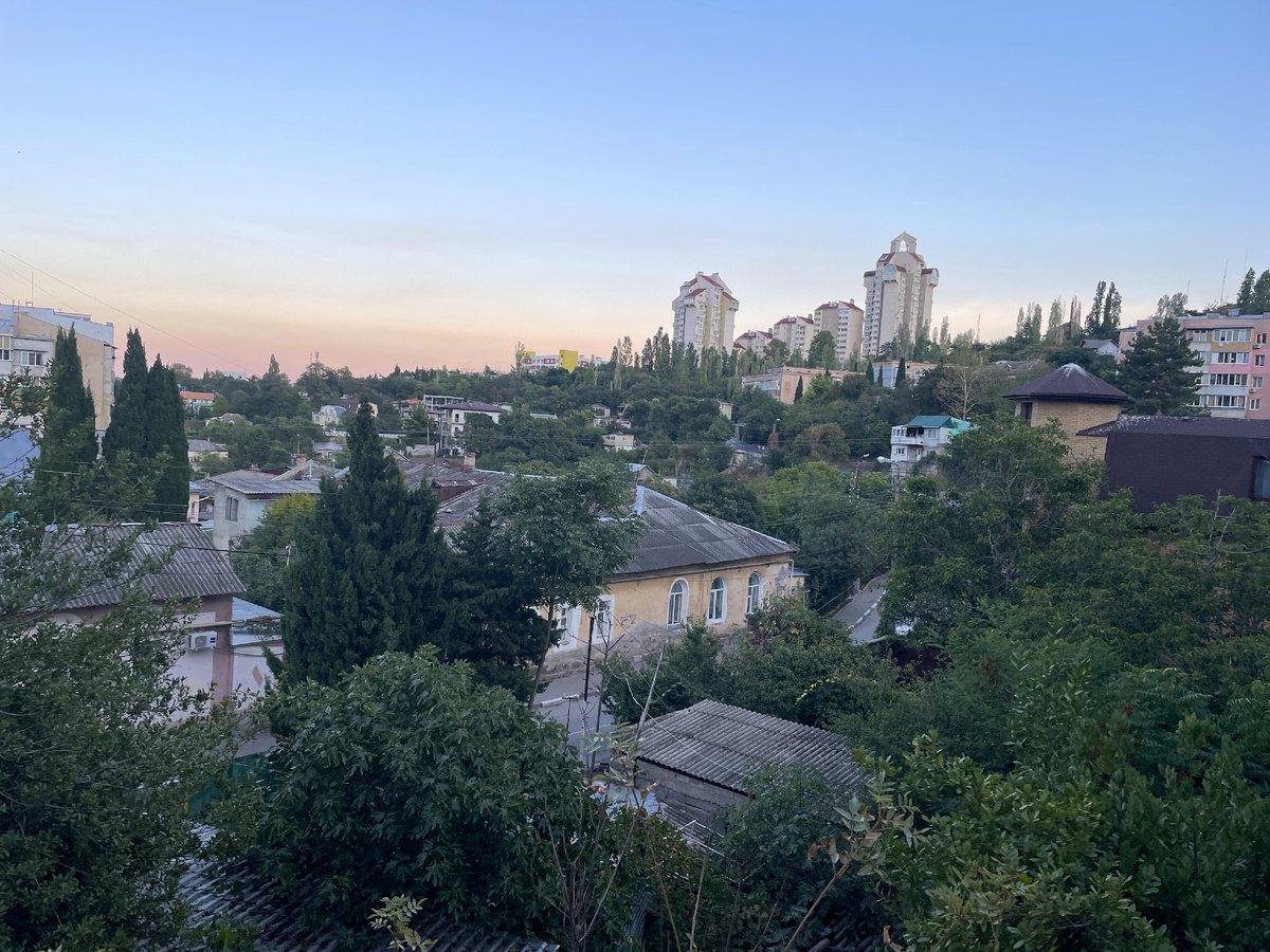 На вечернюю Ялту открывается такой вид: белые домики будто утопают в зелени. Они, то тут, то там, местность гористая и поэтому они так смотрятся. А вдали горы, на которых еще задержалось солнце чуть окрасив макушку позолотой, еще немного и все станет серо сизым. Люди встречаются крайне редко и то местные.