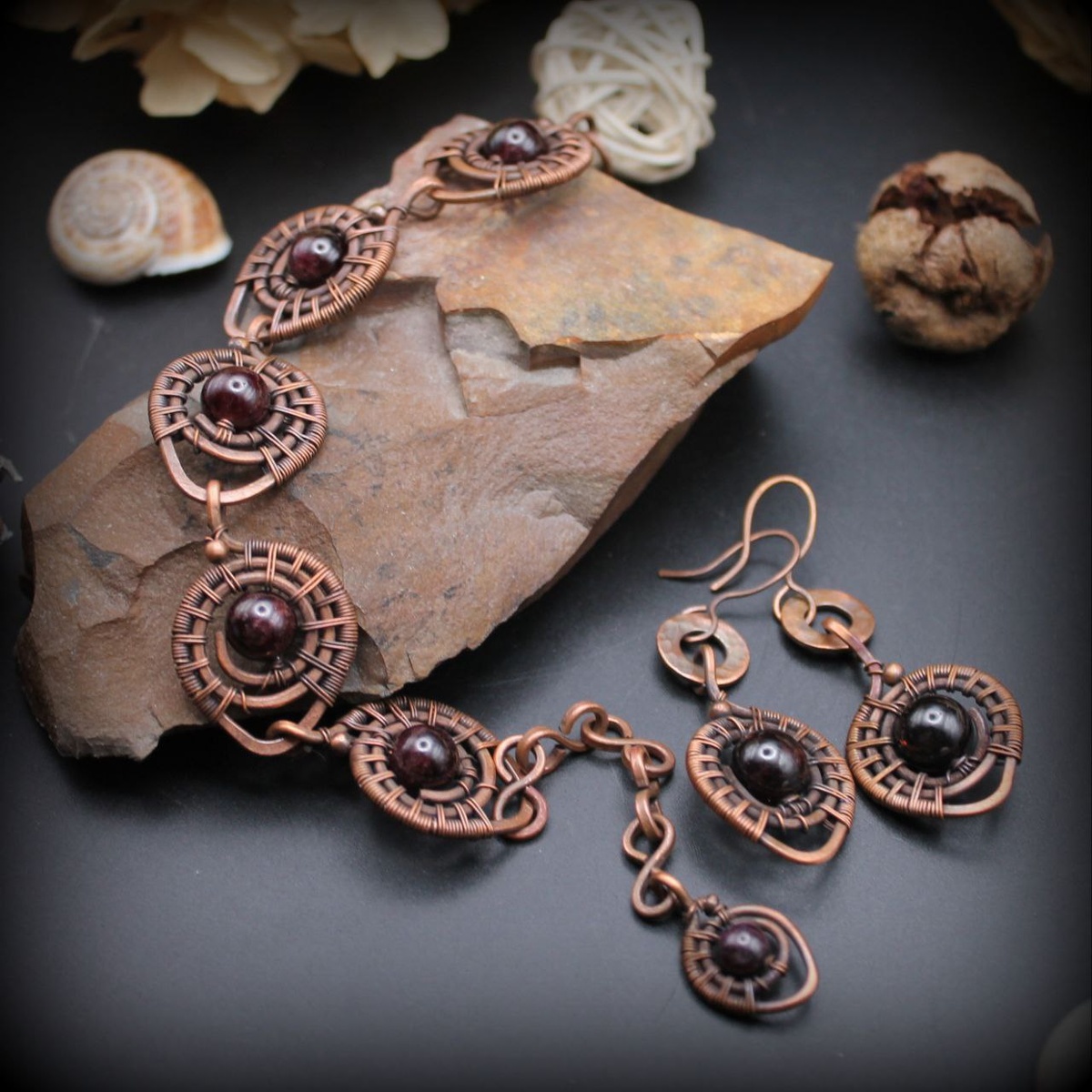 Комплект украшений с гранатом, браслет и серьги. Комплект украшений ручной работы из меди и камней. Классическое сочетание теплого оттенка патинированной меди и гранатовых бусин глубокого винного цвета. Браслет-цепочка, регулируется от 17 до 23 см. Удобная застежка. Серьги крупные, длина без швенз 4,5 см, швензы изготовлены вручную. #медныесказки #ручнаяработа #комплектукрашений #медныйбраслет #медныесерьги #браслетсгранатом #гранат #гранатовыйбраслет #wirewrap #украшенияручнойработы