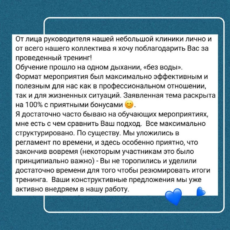 С удовольствием публикую отзыв о моей работе от главного врача клиники White Wave (ООО «Пульс-Сервис») Н.В. Крячковой В моей работе не так часто бывают отзывы, потому что чаще я как медиатор работаю под условием соглашения о конфиденциальности. В данном случае проводила мини-тренинг и, самое главное, профилактический восстановительный круг в медицинском коллективе (методика "Круг сообщества" - восстановительная программа прекрасно работает в трудовых коллективах) 📍На сегодняшний день география проведенных кругов сообщества: Москва, Московская область, Санкт-Петербург, Нижний Новгород, Мурманск, Ленинградская область, Стамбул ОРГАНИЗАЦИИ: - школы (педагогический коллектив), - медицинские организации разного профиля, - кафедры вузов, - коммерческие организации - крупные налогоплательщики 😉 (руководящий состав, отделы и подразделения), - завод (производство техники), - сетевой магазин (персонал), - общественная организация, - фонд, - небольшие коммерческие организации. Использую эт