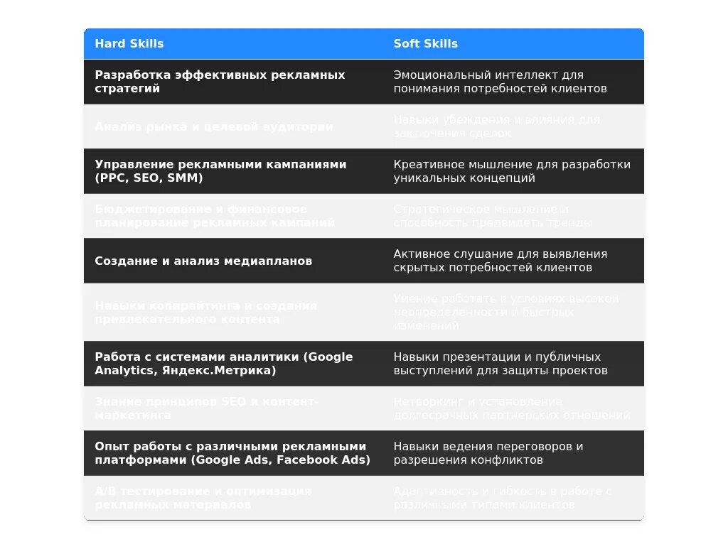- На какие качества и навыки делать акцент: Коммуникабельность, креативность, аналитическое мышление, умение работать в команде, знание основ маркетинга и рекламы, владение профильными программами (например, графическими редакторами, системами аналитики).