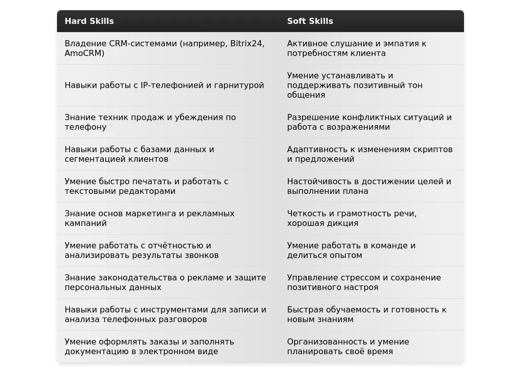 - B2B (IT-решения): "Холодные звонки", "Выявление потребностей клиентов", "Предложение IT-решений", "Ведение деловых переговоров".