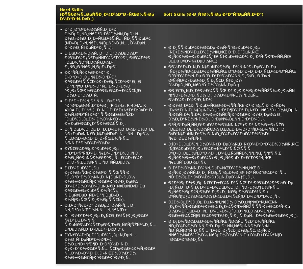 - Инженер-механик по холодильному оборудованию (диагностика, ремонт, обслуживание) – перечислены основные навыки.