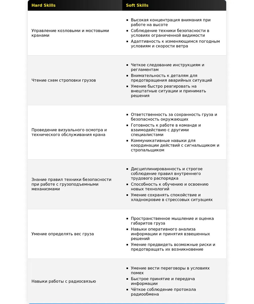 Раздел "Навыки" должен демонстрировать ваши профессиональные компетенции и соответствовать требованиям вакансии. Важно перечислить не только ваши общие навыки, но и конкретные умения, необходимые для работы крановщиком.