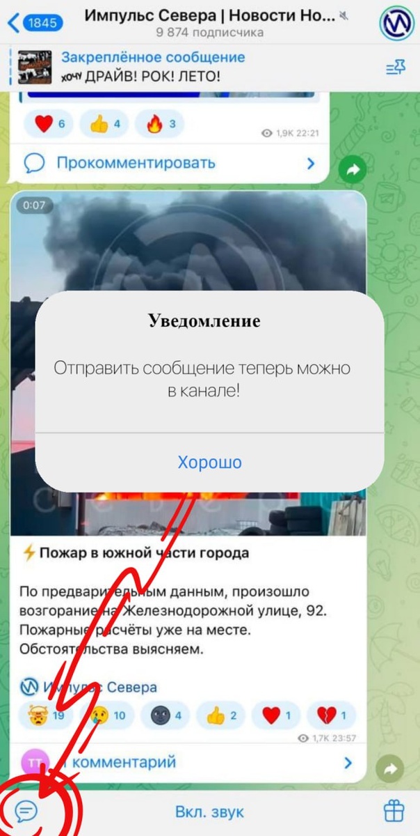 Хорошая новость для наших подписчиков! Теперь вы можете отправлять личные сообщения нам прямо в канале. Достаточно нажать на значок (отметили на фото)⬆️ 📎Если у вас ещё не появилась функция, нужно обновить приложение. ❤️ Импульс Севера