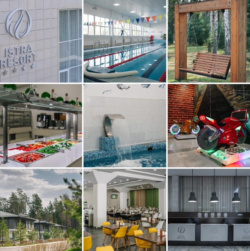 🌿 «ISTRA RESORT» / «Истра Резорт» санаторий ⭐️⭐️⭐️⭐️ 📍Московская обл., Истринский р-н, д. Аносино 💰 17-20 июня Стандартный 28 800 р. на 2 взр 💰 26-29 июня Стандартный 25 800 р. на 2 взр 💰 08-11 июля Стандартный 25 800 р. на 2 взр 💰 14-17 июля Стандартный 30 600 р. на 2 взр 💰 28-31 июля Таунхаус 57 600 р. на 2 взр В стоимость включено: ✅Проживание ✅3-разовое питание «шведский стол ✅Неотложная медицинская помощь ✅Первичный осмотр терапевта ✅Посещение бассейна и тренажерного зала (1 час в день) ✅Прокат спортивного инвентаря (1 единица 1 раз в день) ✅Библиотека ✅Охраняемая автостоянка 🍓 «ISTRA RESORT» -- санаторий располагается на большой благоустроенной территории, общей площадью более 100 гектар, со всех сторон окруженной лесом. 🔔 Для расчета на ваши даты и количество гостей 💌 Напишите нам личное сообщение @Podmoskovie_bron ☎️ 8495-241-01-38
