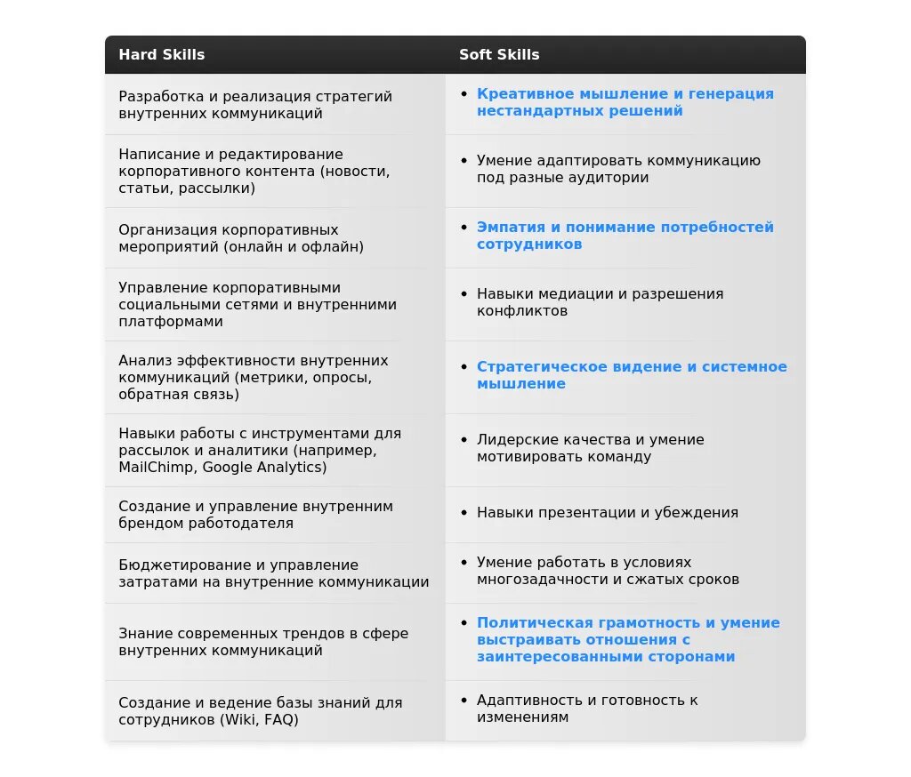 Для начинающих специалистов особенно важны следующие качества и навыки: коммуникабельность, умение писать тексты, креативность, организаторские способности, знание современных инструментов внутренних коммуникаций.