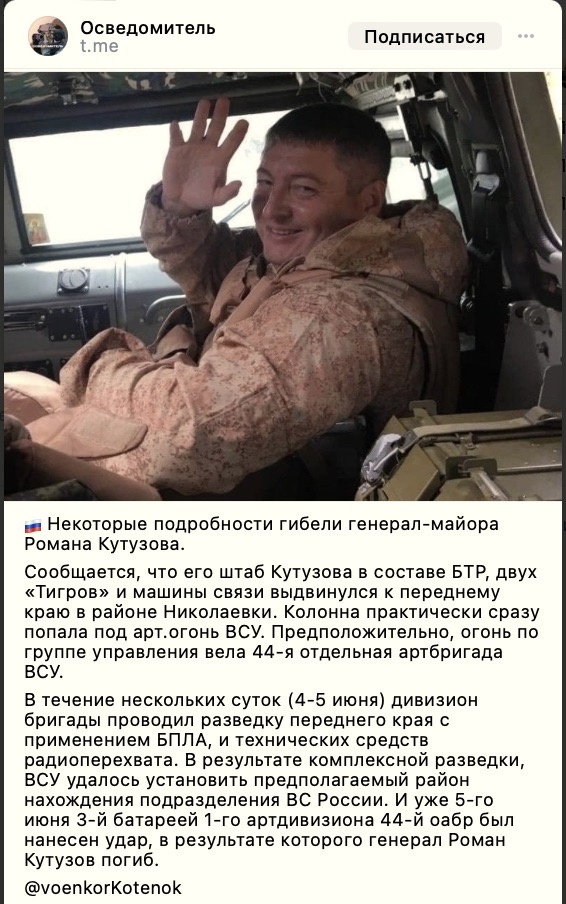 - Главной новостью дня стала прискорбная весть о гибели командующего Первого армейский корпуса ДНР. В ходе специальной военной операции на Украине погиб генерал-майор Роман Владимирович Кутузов. Это произошло в районе населенного пункта Николаевка Попаснянского района ЛНР. Генерал Кутузов был не из робкого десятка и лично повёл в бой боевое подразделение. К сожалению, этот бой стал для него последним. Генералу Кутузову было всего 43 года.