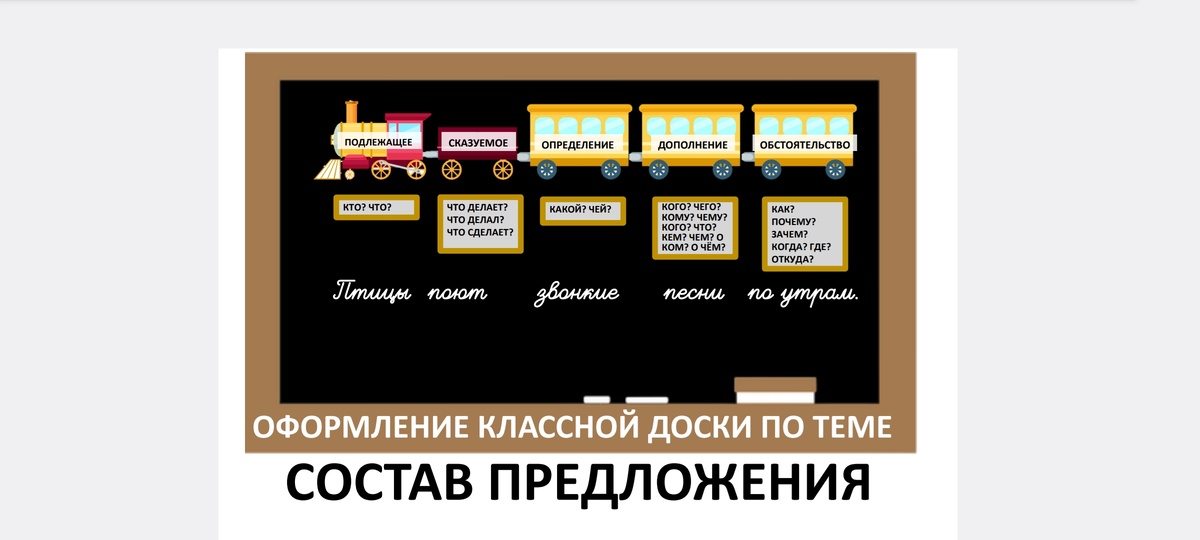 - учитель оформляет доску, прикрепляя изображения по мере объяснения материала, и пишет на доске примеры предложений, имея возможность варьировать количество вагонов;