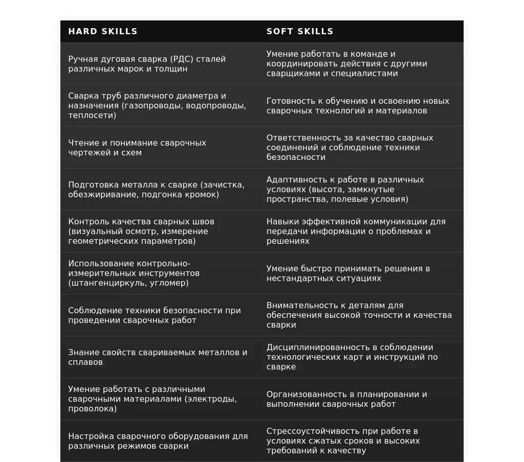 - Производство: "Сварка металлоконструкций", "работа с чертежами", "контроль качества сварных швов", "обеспечение соответствия требованиям ГОСТ".