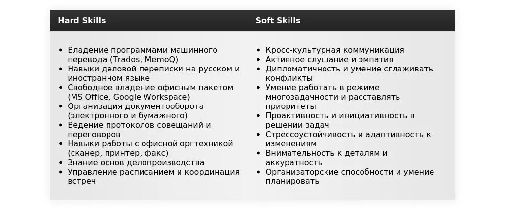 Наиболее значимые навыки, релевантные для позиции секретаря-переводчика.