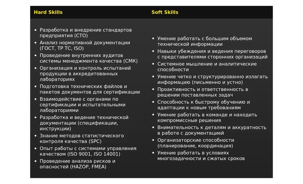 - Навыки и качества: Укажите навыки, полученные в процессе обучения, которые релевантны вакансии (например, знание стандартов, умение работать с нормативной документацией, аналитические способности).