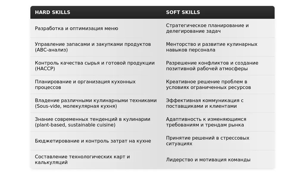 - Ресторан высокой кухни: "Опыт работы с премиальными продуктами", "Разработка авторских блюд", "Управление командой профессиональных поваров".