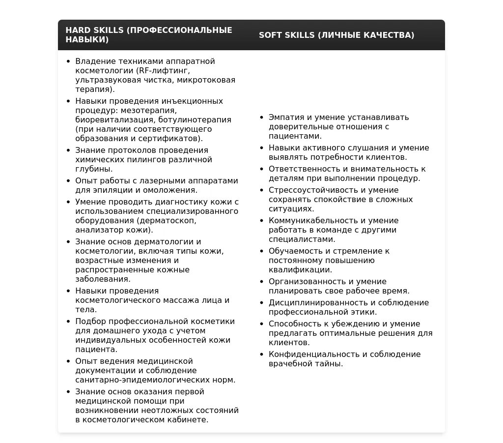Анализ: Важна работа с конкретными аппаратами, знание и соблюдение протоколов. Ключевые слова: *аппаратная косметология, SMAS-лифтинг, микроигольчатый RF, лазерное омоложение, протоколы процедур*.