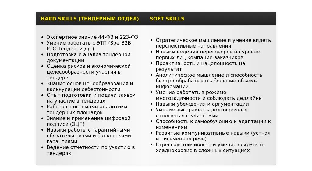 - Для вакансий, требующих опыта работы с тендерами: "участие в тендерах", "подготовка тендерной документации", "выиграл тендер", "соблюдение требований 44-ФЗ и 223-ФЗ".