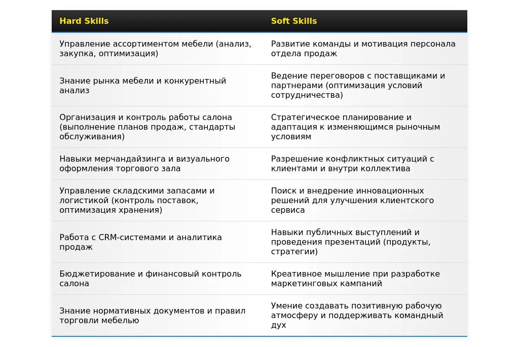 - Обязательная информация:Ключевые навыки и компетенции, релевантные должности директора салона мебели (например, управление продажами, знание мебельного рынка, навыки управления персоналом).