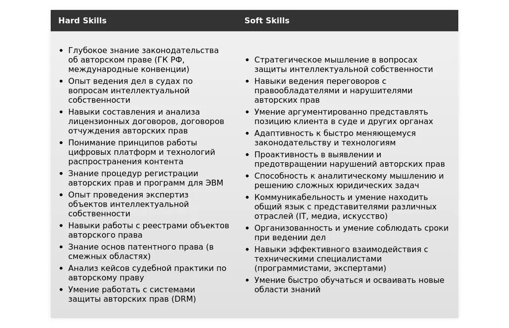 - Что обязательно включить:Ключевые навыки и компетенции, релевантные профессии юриста по авторскому праву.
