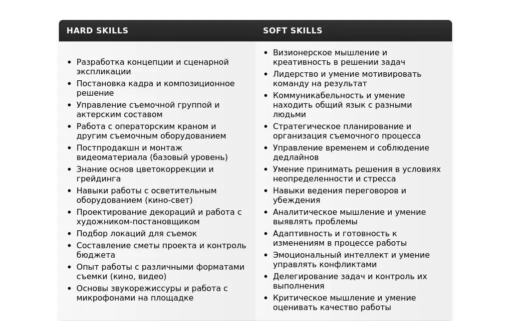 - Для вакансий в кино: "Разработка визуального стиля", "Работа с оператором и художником-постановщиком", "Руководство съемочной группой", "Обеспечение соблюдения бюджета и графика".