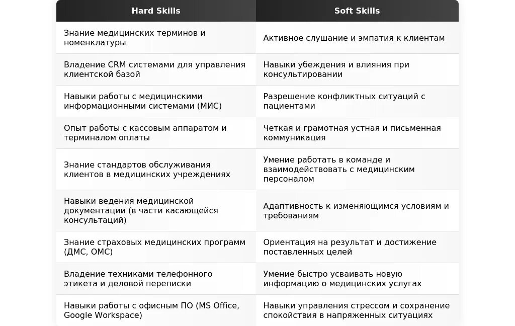 - Навыки: Составьте список ключевых навыков, указанных в вакансии. Это может быть работа с пациентами, ведение документации, знание кассовой дисциплины, навыки работы с компьютером и оргтехникой, знание языков (например, английского), и т.д.