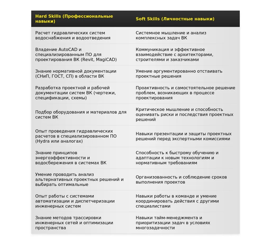 - Обязательная информация:Ключевая квалификация (например, "опытный проектировщик ВК" или "начинающий специалист в области проектирования систем водоснабжения и водоотведения").