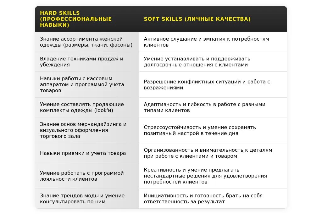 - Для вакансий с акцентом на знании ассортимента: "Знание брендов женской одежды", "Знание модных трендов", "Умение создавать стильные образы", "Ориентирование в ассортименте", "Предоставление экспертных консультаций по стилю".