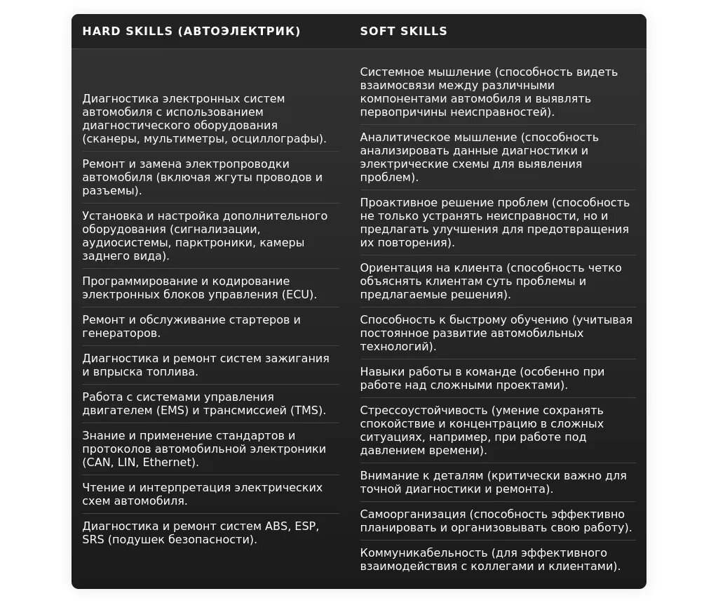 - Диагностика: "Диагностика электрооборудования", "Выявление неисправностей", "Чтение электросхем", "Работа с диагностическим оборудованием".