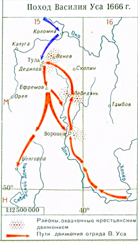 - поход Василия Уса на Москву (1666) — до 800 человек голытьбы или недавно бежавших от помещиков на Дон крепостных и присоединившиеся к ним беглые солдаты, посадские (горожане), помещичьи крестьяне и холопы (безземельные дворовые слуги) Скопинского, Дедиловского, Крапивенского, Каширского, Серпуховского и Соловского уездов числом более 7000 прошли от Воронежа до Тулы, грабя дворянские поместья, но были вынуждены вернуться на Дон при встрече большого царского войска:
